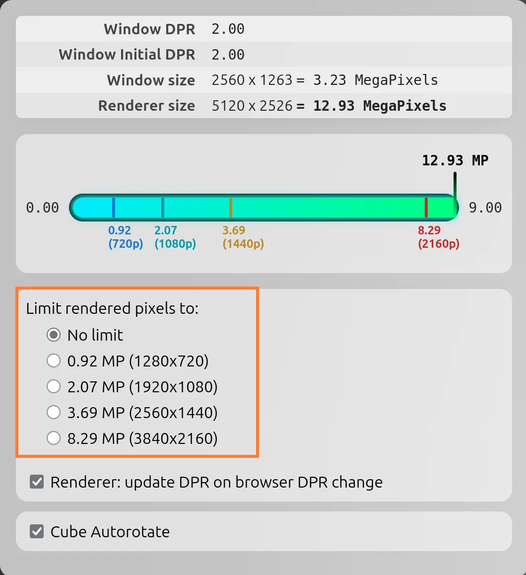 ThreeJS renders to a buffer of 5120×2526 pixels (~= 12.93 MegaPixels) even though the monitor’s physical resolution is 3840×2160.