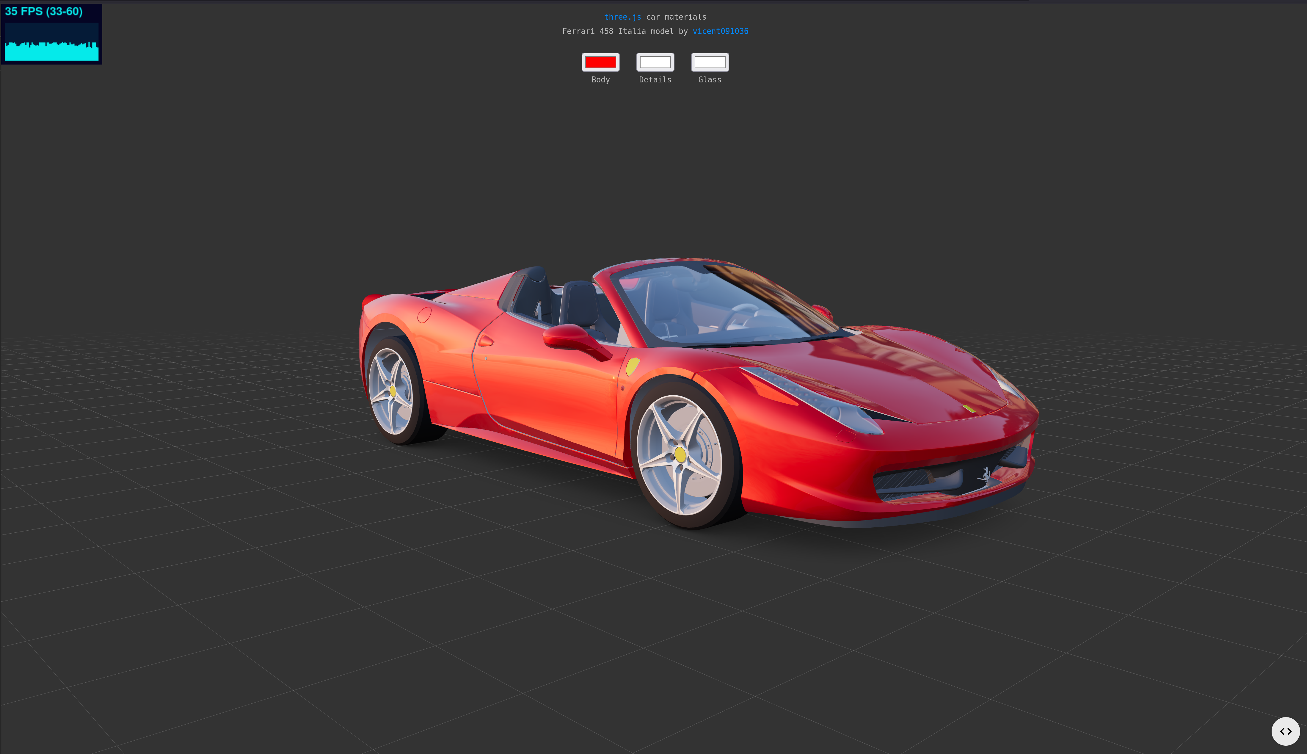 Let’s use the official ThreeJS car example scene as a reference. The scene uses a mix of MeshStandardMaterial and MeshPhysicalMaterial with transmission, so it’s a pretty demanding setup for ThreeJS and it makes a good test case.